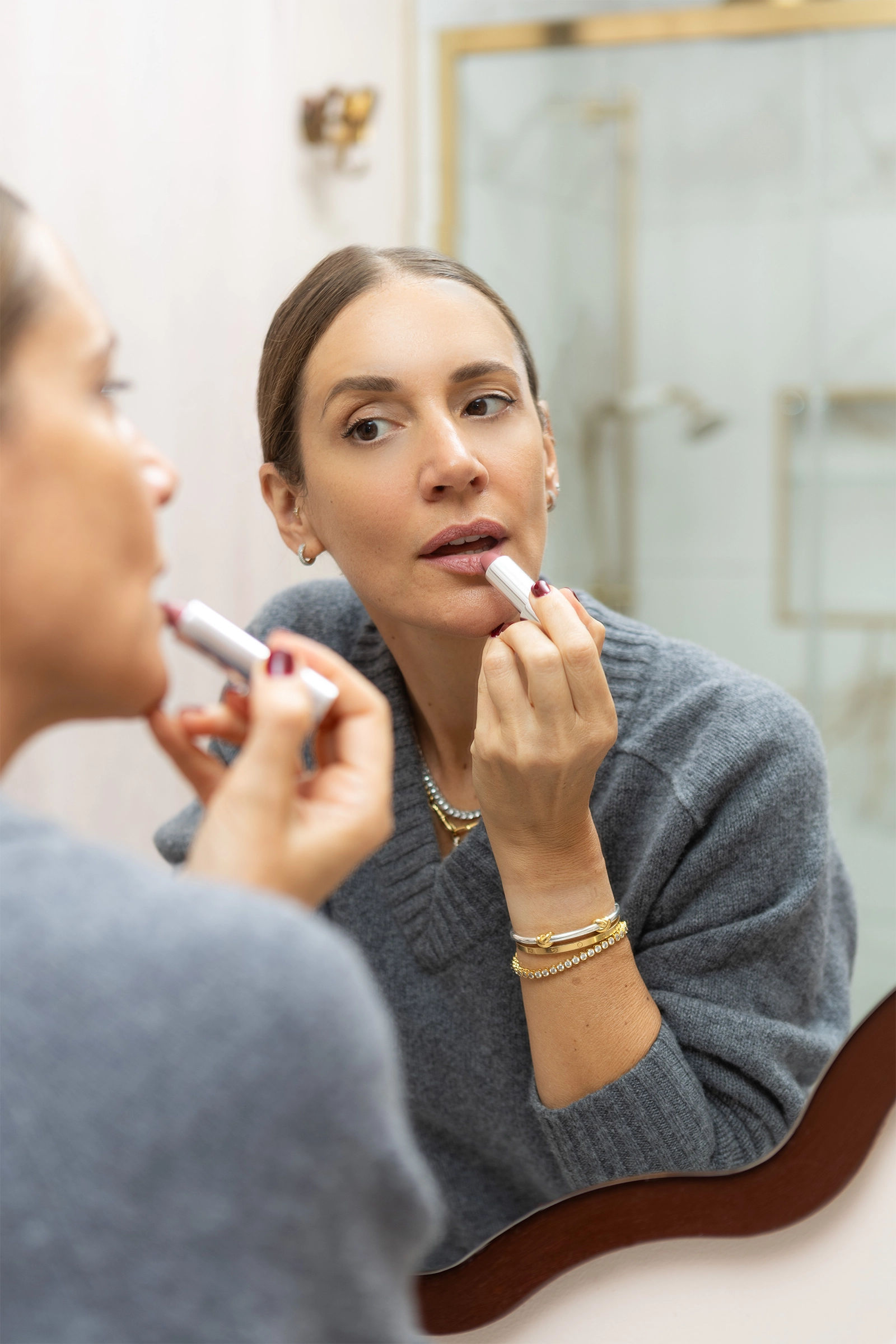 Sweep onto lips straight from the bullet. For maximum impact, add 2–3 layers. For a more casual “blotted” lip look, tap the lipstick with your index finger and gently dab the colour onto lips with your fingertip.