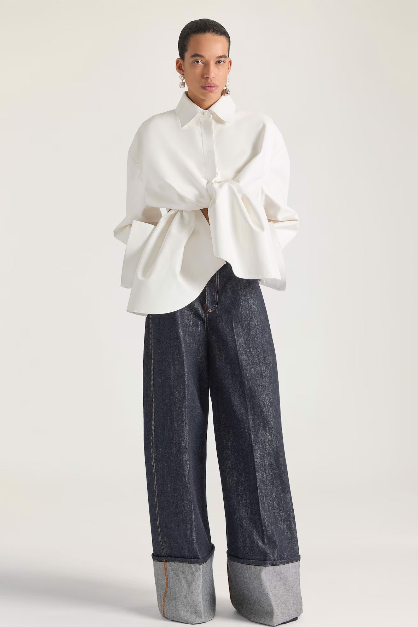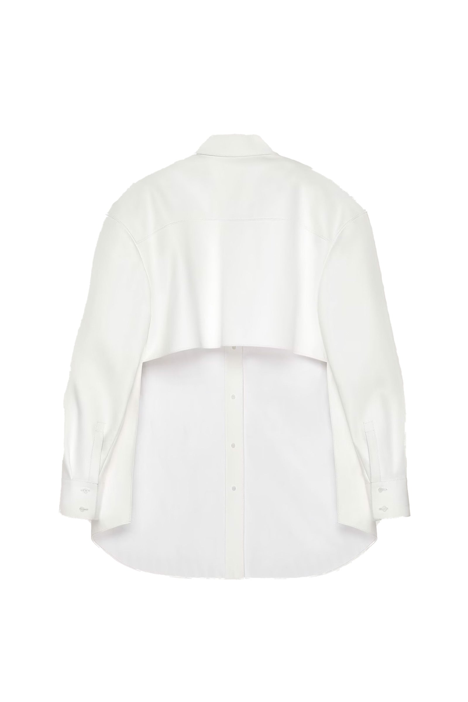 Luxe white nappa leather shirt with striking open back design. Soft, supple leather drapes beautifully for an effortless sophisticated look. Perfect for evening events, upscale dinners, or fashion-forward occasions. Layer over basics or wear solo for maximum impact. A modern alternative to traditional silk blouses.