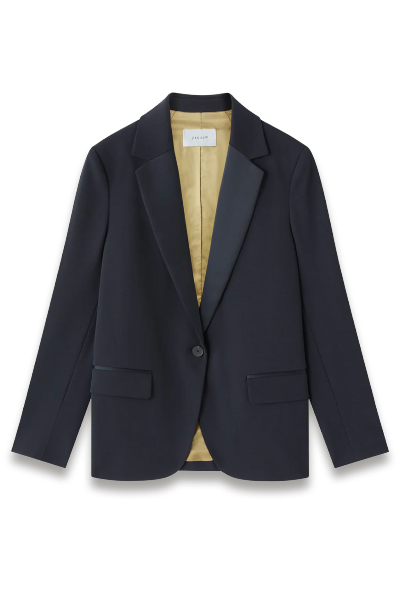 Elevate your tailoring with this refined satin lapel blazer from Jigsaw. The shortline cut creates a contemporary silhouette that flatters the frame, whilst luxurious satin lapels introduce subtle sophistication. Crafted with precision tailoring, this piece transitions seamlessly from boardroom to evening occasions. A versatile wardrobe essential that pairs effortlessly with tailored trousers or midi skirts for polished, intentional styling.